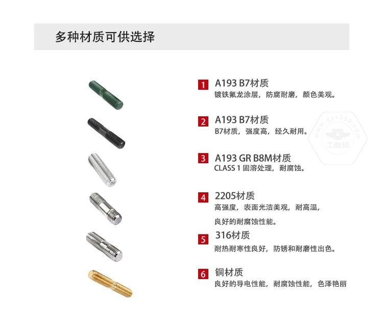 3、常用的雙頭螺柱材質:35鋼、45鋼、30CrMo、35CrMo42CrMo、25Cr2MoV、660304、316、304L、316L、B7B7M、B16、B8、B8M、A320L72205/2507等材質。