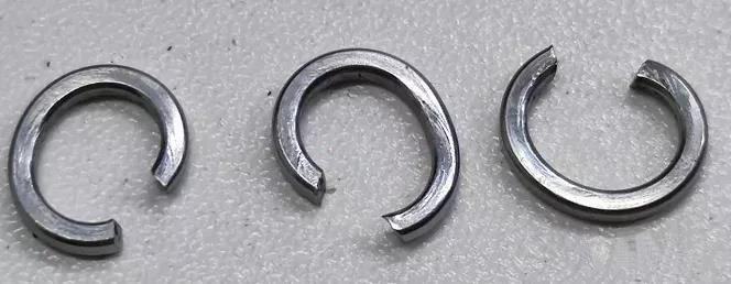 4、彈簧墊圈的切口毛刺:由于加工工藝的原因,切斷面后的彈簧墊圈切口處肯定存在或大或小的毛刺,彈簧墊圈經(jīng)過熱處理后,這些帶有較高硬度的毛刺或?qū)⒅苯忧度肫綁|圈或被連接件機(jī)體中,導(dǎo)致螺栓螺母擰緊過程中彈簧墊圈拉長而墊圈失效。
