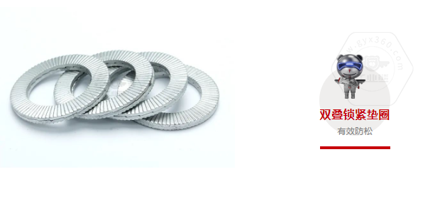 特點:雙疊鎖緊墊圈適用于振動劇烈的場合,通過楔形防松原理,可以起到有效的防松作用。