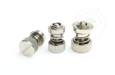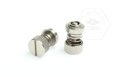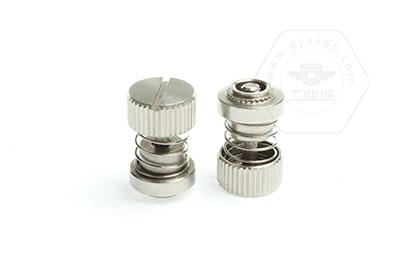 手緊螺釘?shù)膲恒T套具有壓花齒,壓裝于于機(jī)箱或薄鈑孔內(nèi)(注:薄板的鉆孔徑相對(duì)應(yīng)彈簧螺釘?shù)膲糊X徑有一定要求的,形成一個(gè)外露的彈簧螺釘,用手?jǐn)Q另一端(即手?jǐn)Q端).因其里面固定有彈簧,螺釘相對(duì)于薄板的另一端來回進(jìn)出。