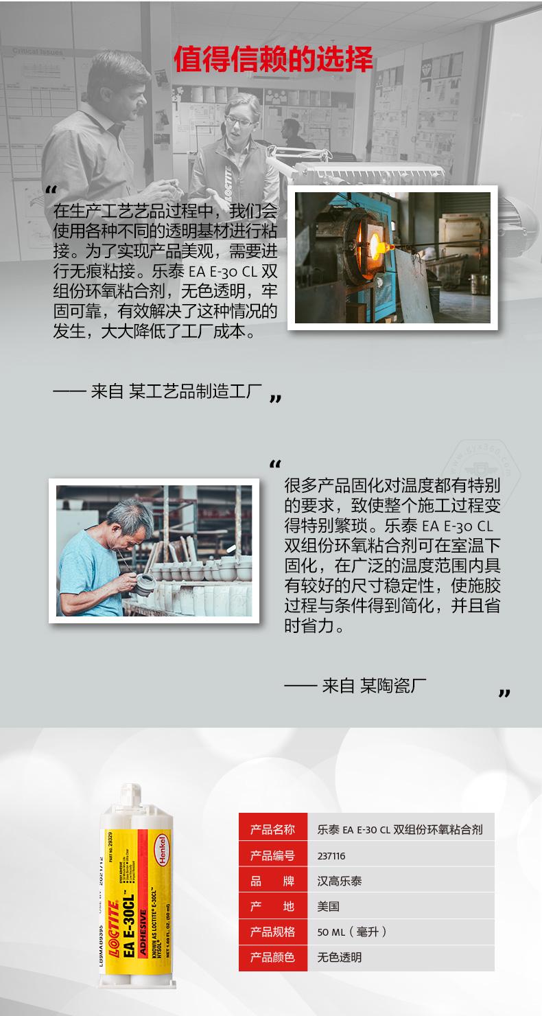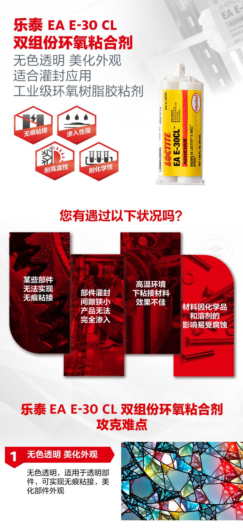 樂泰EA E-30 CL雙組份環(huán)氧粘合劑是一款無色透明的工業(yè)級環(huán)氧樹脂膠粘劑。樂泰EA E-30 CL雙組份環(huán)氧粘合劑適用于透明部件,可實現(xiàn)無痕粘接,美化外觀。樂泰EA E-30 CL雙組份環(huán)氧粘合劑低粘度、滲入性強(qiáng),能夠有效滲入小間隙并填充縫隙,適合灌封應(yīng)用。樂泰EA E-30 CL雙組份環(huán)氧粘合劑還具備耐高溫性和耐化學(xué)性,可用于玻璃、光纖、陶瓷、金屬和許多硬質(zhì)塑料的粘接。