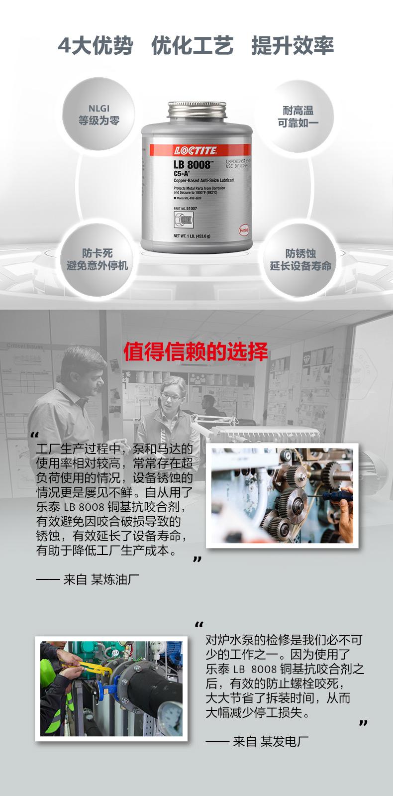 樂泰LB8008銅基抗咬合劑是一款通用型耐高溫抗咬合劑。樂泰LB8008銅基抗咬合劑耐溫可達(dá)982℃,具備防銹蝕、防卡死、NLGI等級(jí)為0等特點(diǎn)。樂泰LB8008銅基抗咬合劑適用于高負(fù)載和極端環(huán)境,可幫助避免咬合破損、延長設(shè)備壽命、減少意外停機(jī)。樂泰LB8008銅基抗咬合劑自帶頂刷并可自動(dòng)攪拌,操作更簡便,適用于采礦、發(fā)電、石化、鐵路、水處理等行業(yè)。