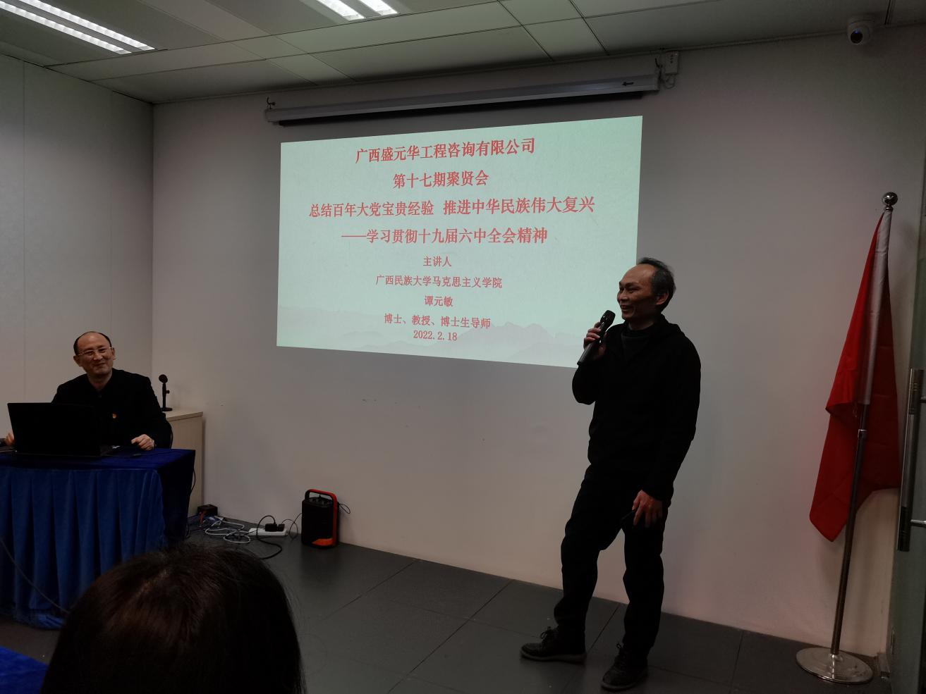 為豐富公司的黨建工作及企業(yè)文化建設(shè),公司于2月18日下午在總部會議室成功舉辦了第十七期期“聚賢會”互動交流講堂活動。本次“聚賢會”是以黨課的形式開展學(xué)習(xí)十九屆六中全會精神的講堂活動,主題為“總結(jié)百年大黨寶貴經(jīng)驗、推進中華民族偉大復(fù)興,解讀十九屆六中全會精神”。 本期活動邀請到的是廣西民族大學(xué)譚元敏教授蒞臨我公司授課,他用生動的語言、精彩的PPT演示,使“聚友”們對黨的十九屆六中全會精神有了更深刻的理解。