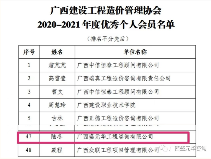 | 【喜訊】熱烈祝賀廣西盛元華獲評廣西建設(shè)工程造價(jià)管理協(xié)會“2020-2021年度先進(jìn)單位會員、優(yōu)秀個(gè)人會員”兩項(xiàng)榮譽(yù)稱號 |