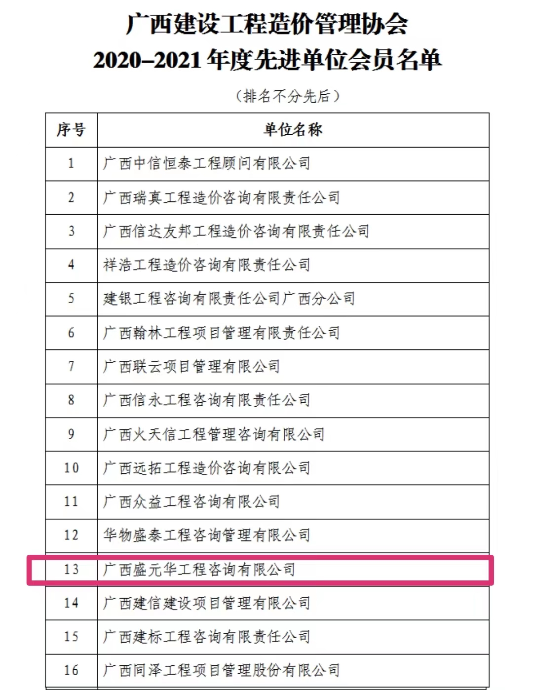 據(jù)悉,廣西盛元華至2019年以來蟬聯(lián)獲得廣西建設(shè)工程造價(jià)管理協(xié)會的先進(jìn)單位會員,這不僅是行業(yè)協(xié)會和社會各界對廣西盛元華篤行不怠,砥礪奮進(jìn)為廣大客戶提供高品質(zhì)服務(wù)的肯定,更激勵了每一位盛元華人以“誠信為本 有諾必踐”為宗旨,在未來的工作中不斷提高服務(wù)品質(zhì),提高行業(yè)競爭力而不懈努力!