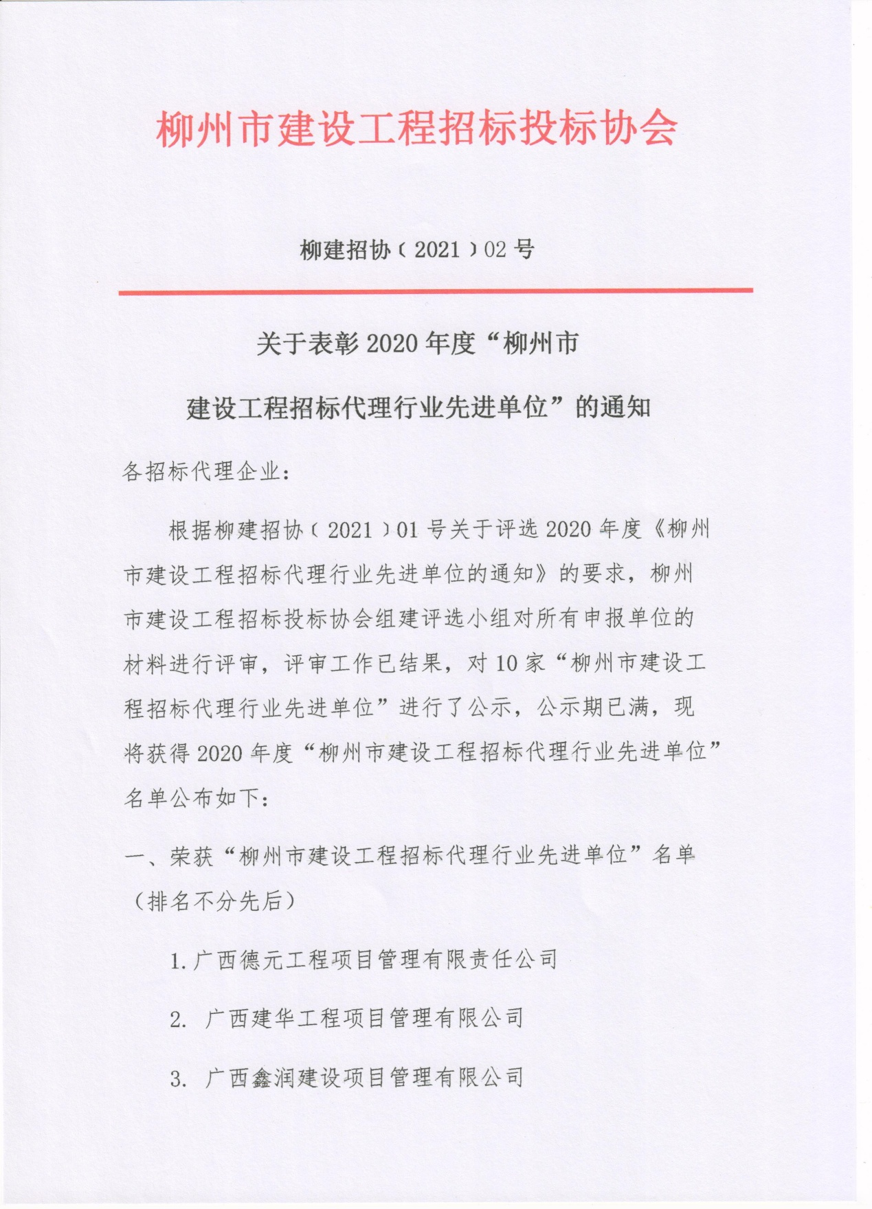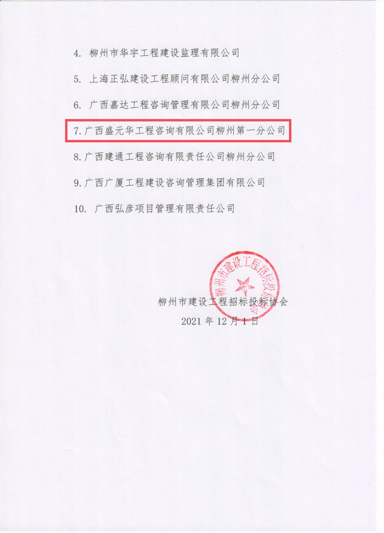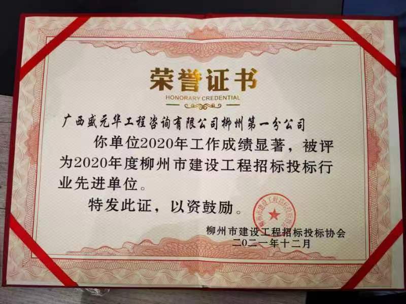 | 喜訊!熱烈祝賀廣西盛元華集團旗下柳州一分公司榮獲2020年度"柳州市建設工程招標代理行業(yè)先進單位"的榮譽稱號 |